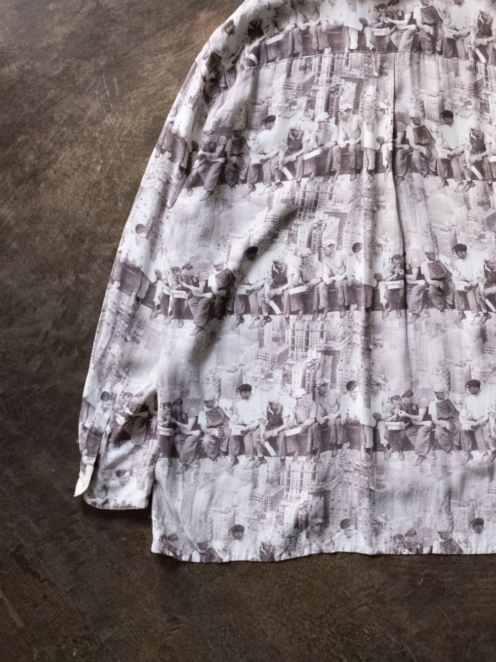 1932年、ニューヨークの高層ビル建設現場で撮影された写真「Lunch atop a Skyscraper」をモチーフにした総柄シャツ。